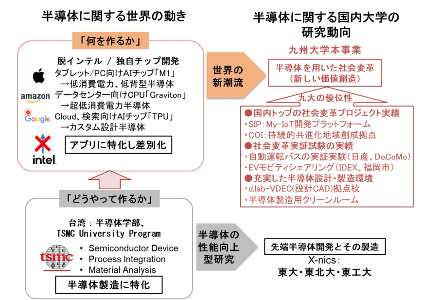 従来は半導体の微細化が中心であったが、現在はアップルやグーグルなど大企業が自社製品に特化したIC設計を行い製造は外部に委託。良い半導体よりも売れる半導体の重要性が増加している。上記の研究センターでは、課題解決型の新価値創造半導体開発と幅広い産業で使える半導体利用者、企業人の育成を三本柱に人材育成に取り組んでいる。