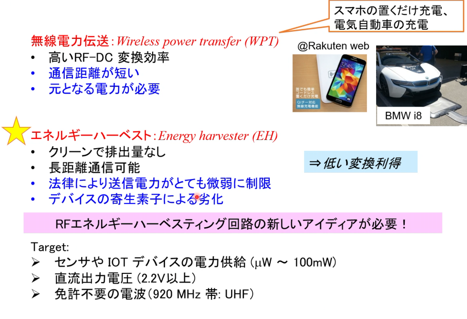 九州大学では、発電所不要の空間に漂う無線電波(RF)を利用した長距離エネルギーハーベスト回路を開発。電波法による送信電力制限を克服する新回路で、交流を直流に変換しセンサー駆動が可能。実験で電波を使い手の温度データをスマホ送信に成功した。無人レジ等で用いられるRFIDの電波も室内に飛んでおり、これを活用している。無線電波を利用し、内視鏡手術で体内の小型クリップを光らせエックス線不要を目指す研究を医学部と実施。電池不可のため、手術室の電気メスが発する電磁波を利用し体内で電気変換する。人体は電波の浸透が難しいが、電気メスの対極板を介した電気回路として体内深部へ電力供給を試みている。半導体素子を2ミリ以下に小型化し、豚での実験で電気メスの電磁波によりLED点灯を確認。屋内ではバッテリーレスでセンサーが稼働し、ユニクロのアンテナで約10m四方をカバー。屋外では福岡タワーのテレビ電波を利用し、最大10km離れても無電池でセンサー駆動とスマホへのデータ送信が可能となった。